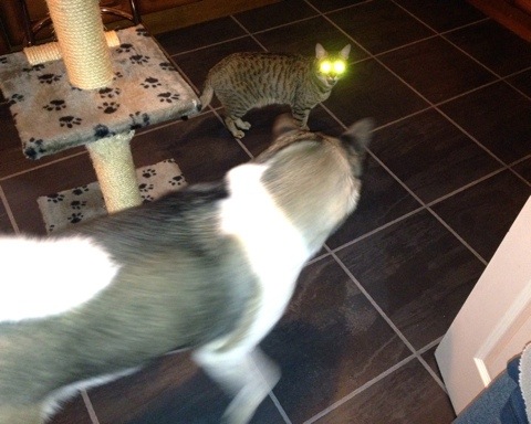 A quickie. iDJ took this pic of Spot trying to destroy Neko with his laser-beam eyes. Zap!