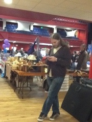 The venue was packed full of exhibitors. I had half of an 8 foot table, and a hard wall behind me. It was tiiiight. There was a painter to my right, and a wood-crafts couple on my left. I had to ask painter lady to move a huge painting so I had some wall space. All of us had to squeeze between my end and painter-lady’s table to get out on to the floor. Here’s a couple of really bad iPad camera shots of the room, from my view point.