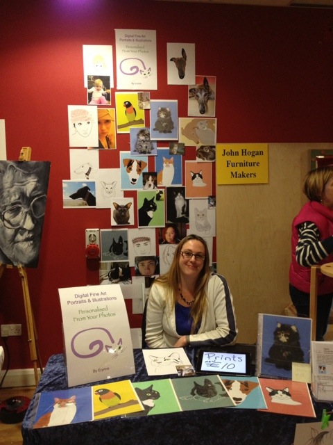 First pic shows the length of the room. There were back-to-back tables in two rows down the centre like that pic, two more in the middle, and then all three outside walls were filled. Lots of people! Bakers, jewellery makers, knitters, photographers, painters, pasties (not usually an Irish thing, and not what strippers wear), woodworkers, a salsa dancing couple that offered lessons, bog oak art, people doing something that had something to do with angels… loads! I was the only one doing digital art, and the only one doing inexpensive portraits.