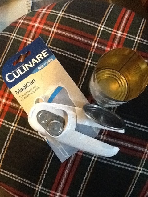 He came home with a fancy-schmancy white plastic thing that barely looks like a can opener. I had to read the instructions before I could figure out how to use it. It fits over the top of the can, and cuts the lid off from the side, rather than cutting down from above. Okay. It’s annoying, but I’ll get used to it.