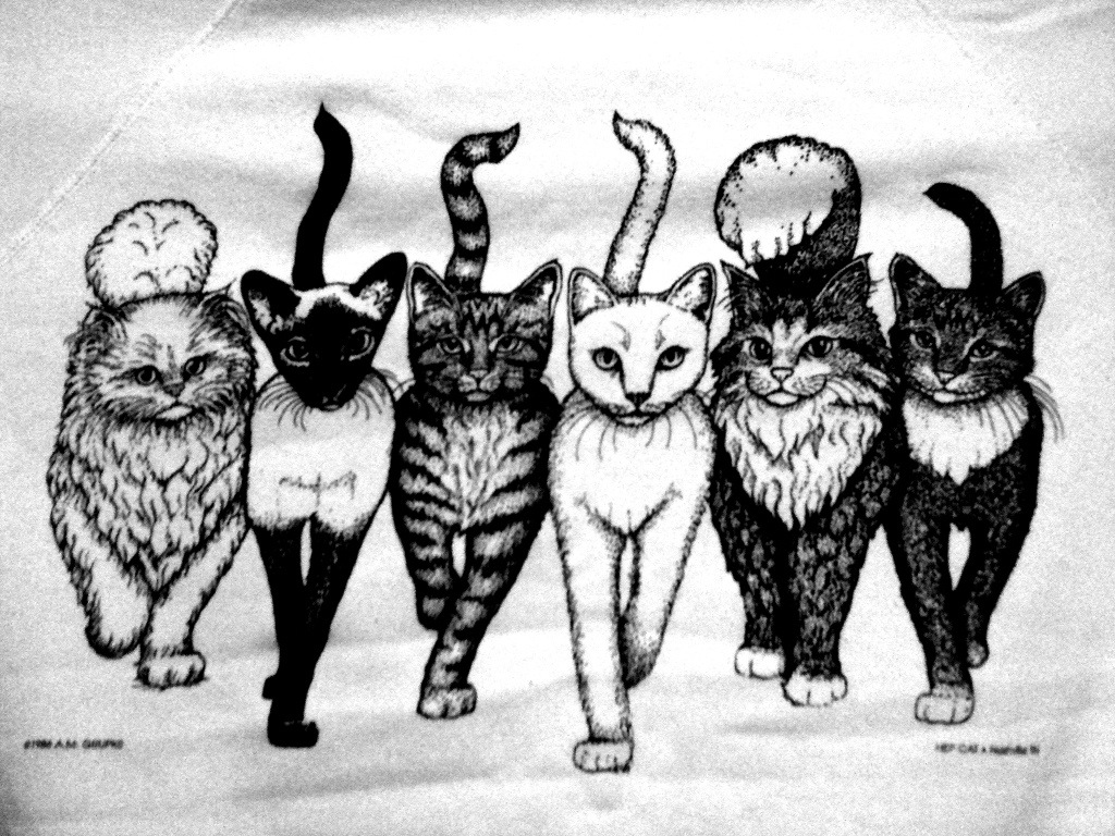 I don’t like the pencil sharpener. It feels mean. But the shirt has a number of variations; I own a Western one, and I have a tote bag with three cats fore and aft. Somewhere around here.