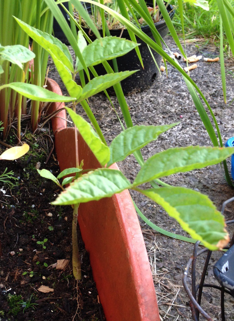 It’s a tree of some sort… Probably a big old weed tree like my grey willow; now well over 12 feet tall and beloved by the little birds. This one is growing in my planter of irises, and I’ve tried to kill it two years in a row by accident. It keeps coming back – maybe an ash tree?