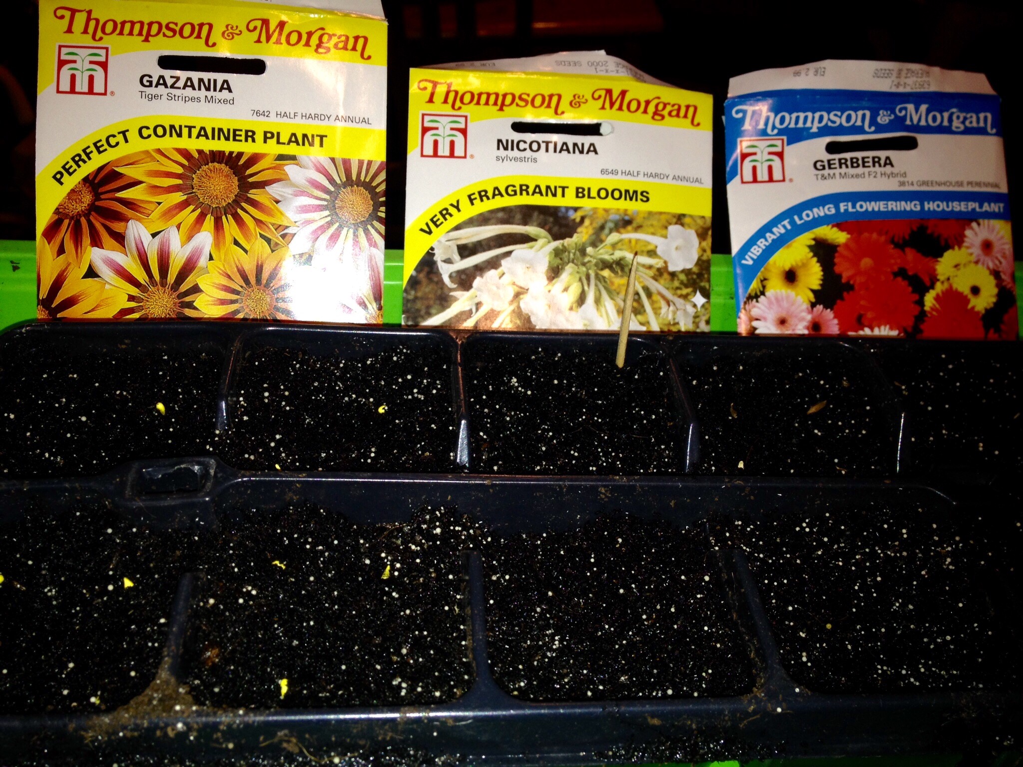 Three more new ones – iDJ wanted the nicotania and the odd-looking gazania. I am desperate for Gerbera daisies – they cost so much as an established plant that I was thrilled to get them as seeds.