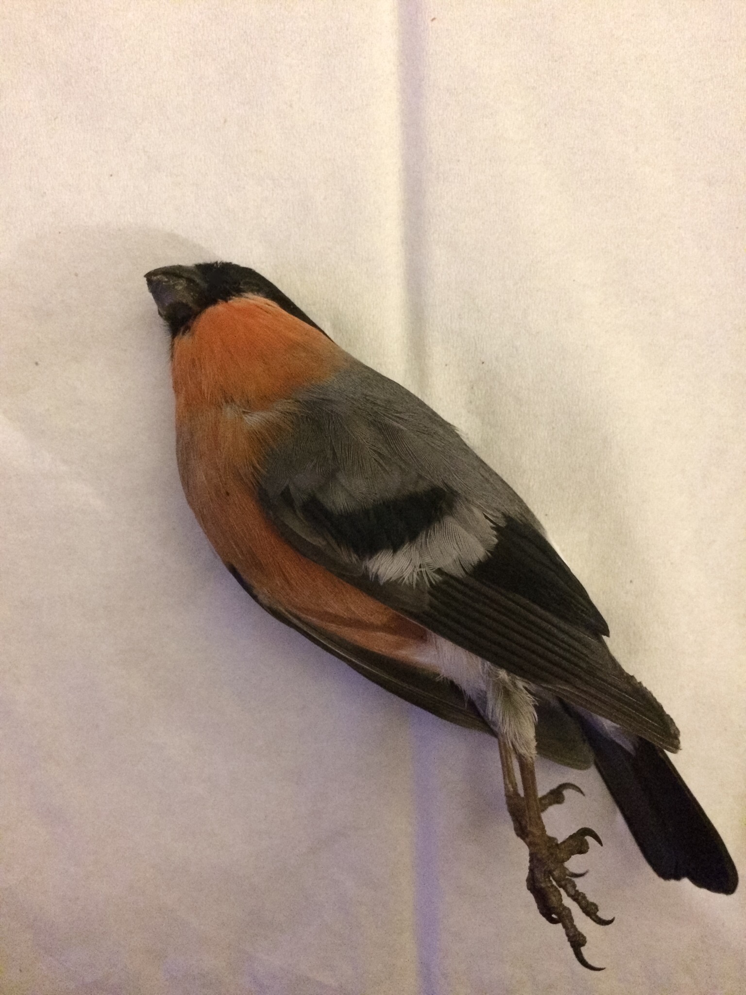 2. He’s beautiful; bullfinches are one of my favourite UK birds because of their gorgeous colouring. I wonder if they found some poisoned mouse bait, or perhaps it was simply that the cold got too much for them… This would definitely be one worth preserving the skin.