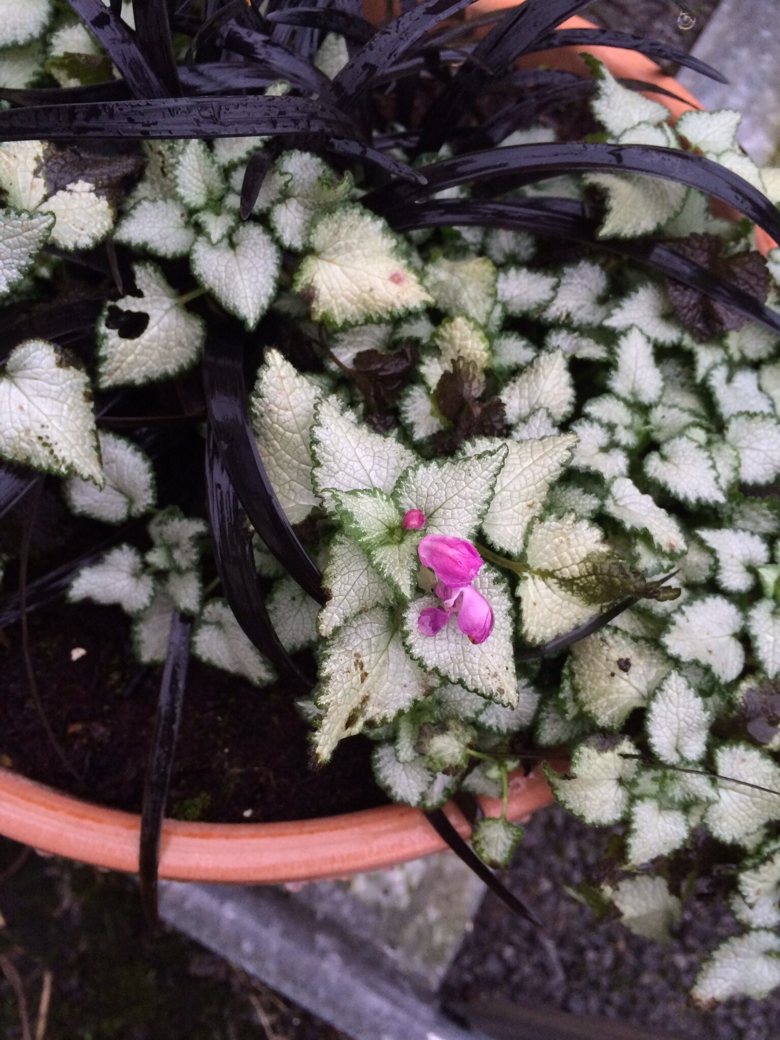 I think the dead nettle may actually be lamium purpureum on account of the purple flower… pretty idea to stick it with the black mondo grass: one with white leaves and a purple flower, and the other with black leaves and a lilac flower.