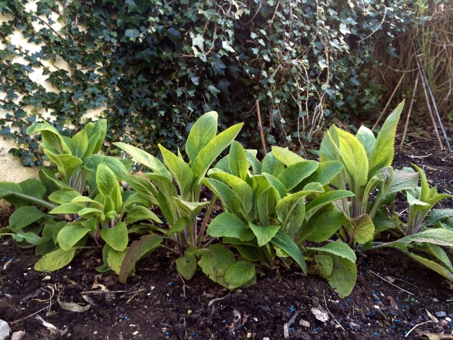 Another thing the slugs have been at: the nicotiana I grew from seed last year. They did fuck-all in 2015, but overwintered well and are now getting big.