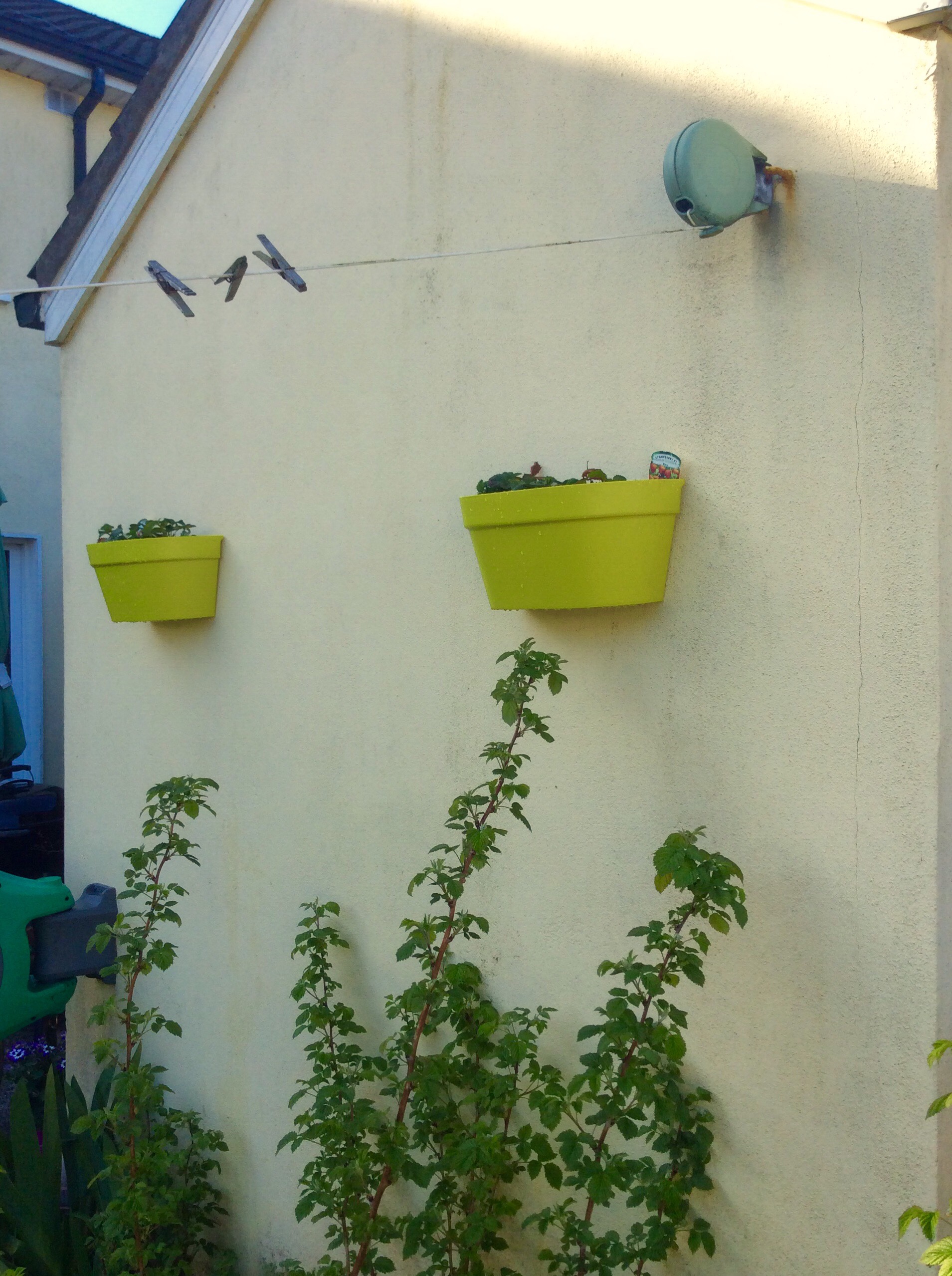 I wanted terracotta strawberry pots, but cut in half for wall-mounting. No such thing could we find. These planters hopefully will do the trick. Out of reach of most slugs (and I dosed them with pellets), liberally topped up with more old Christmas tree needles, and screwed into the wall! I hope they are happy there. And that the corvids don’t figure out it they are a nice and safe buffet.