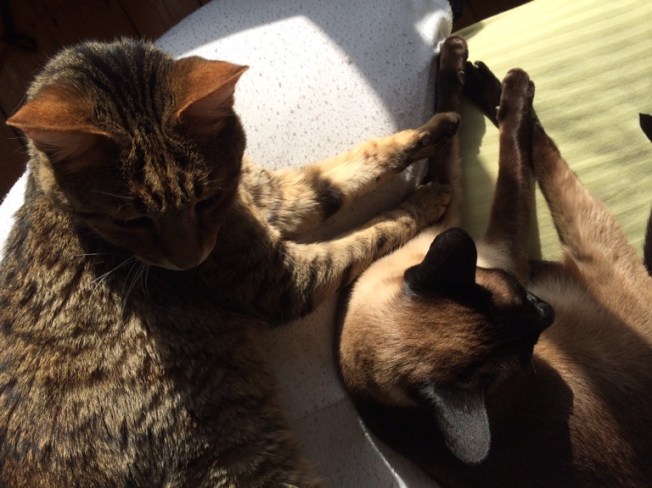 The boys earlier this evening. Panned out in the sun, Spot on my leg-pillow and Lokii simply having to be close to his ‘brother’.