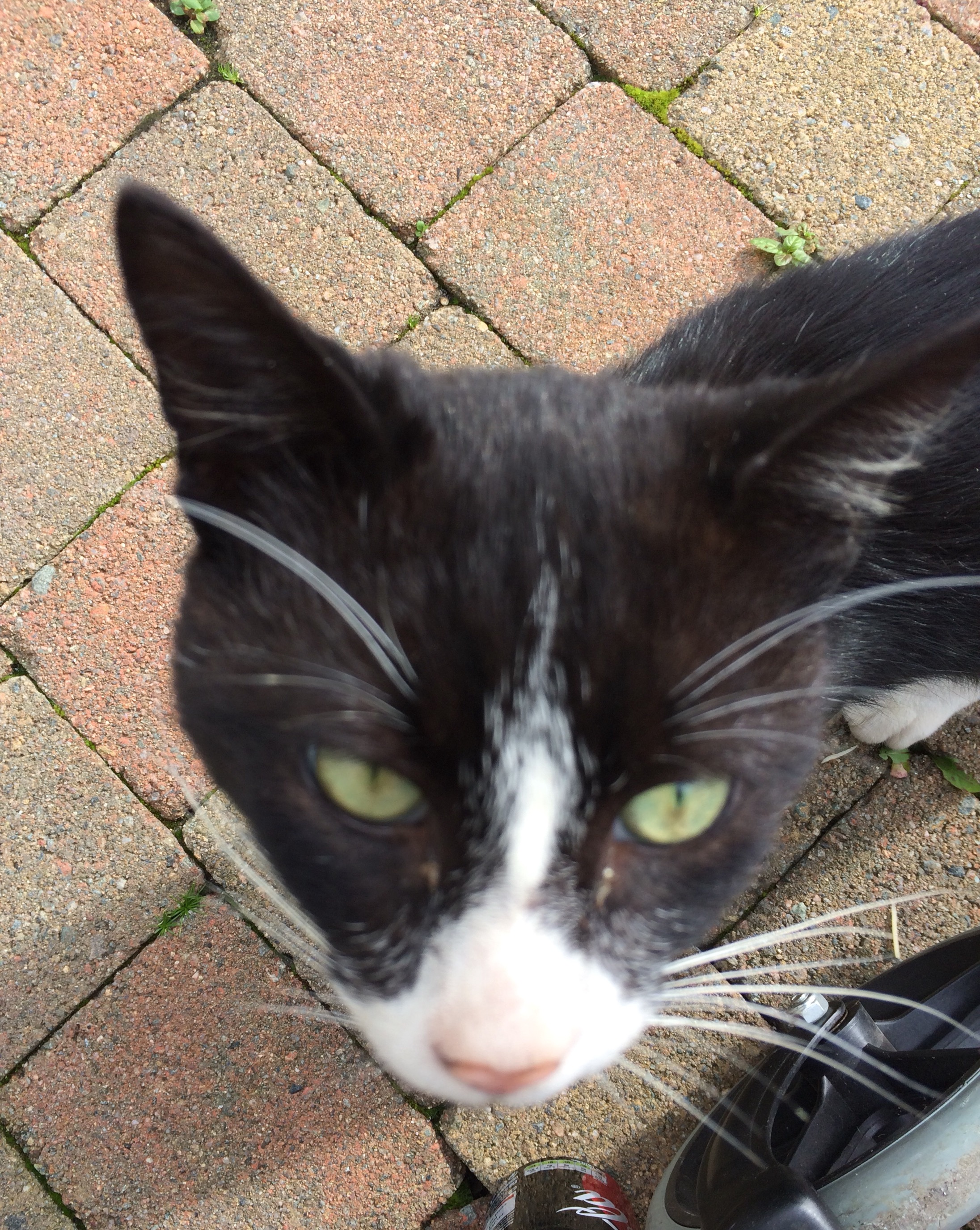 He is also definitely not neutered, either. Easy to tell with the lads. Dammit. He wasn’t afraid of me one bit after I gave him part of my lunch, and even let me pick him up and put him on my lap. He hung out with me by flopping on the ground beside my chair after the food was gone and he no longer cared to be loved on. Unlike Peggy, who always wanders off to do cat stuff.