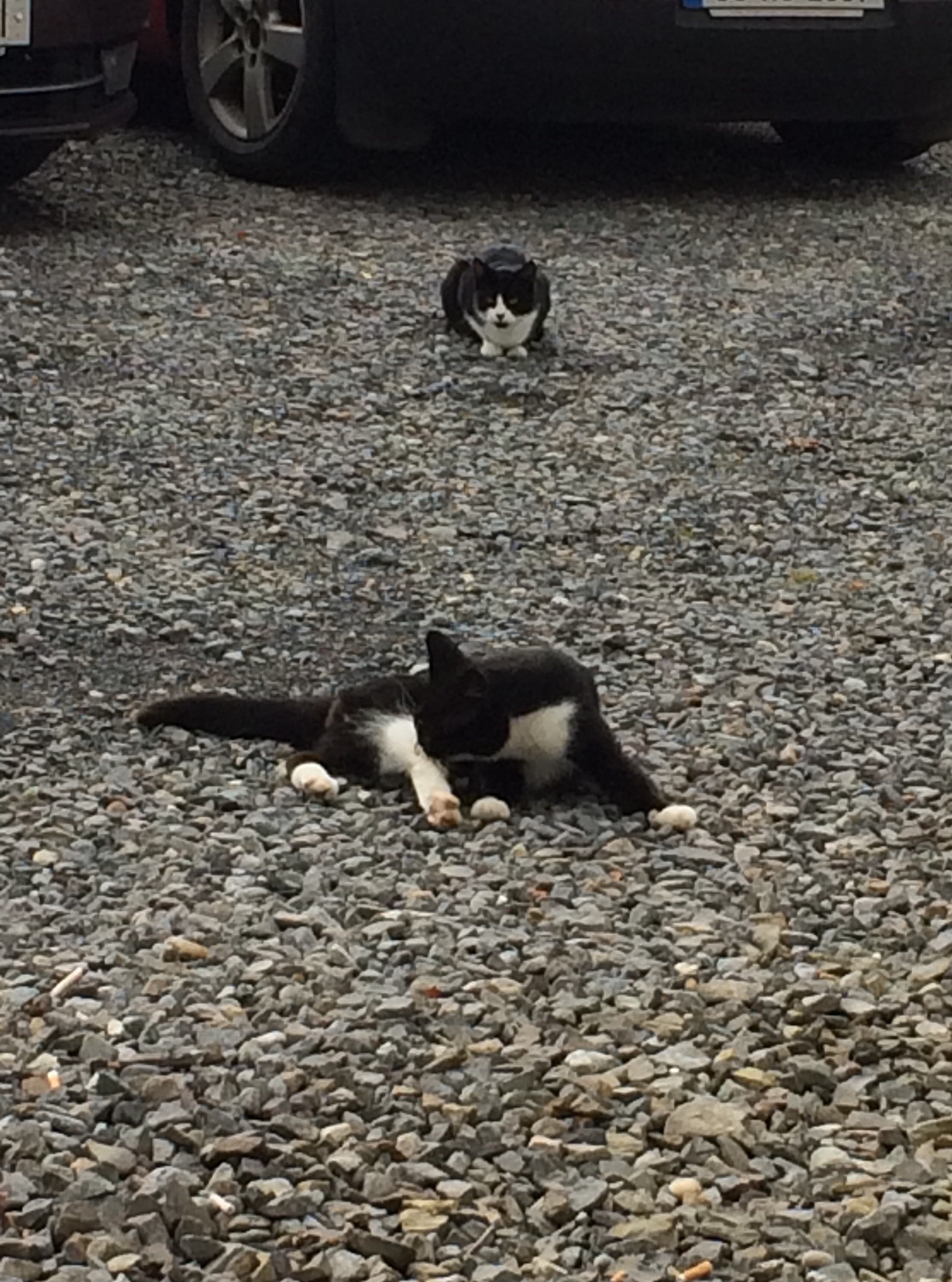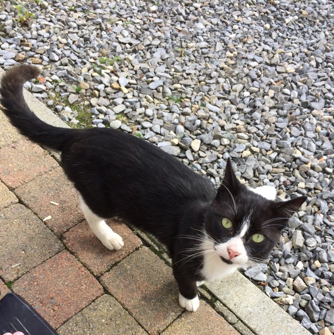 Worryingly, he is a lot less afraid of cars and big trucks than he should be; like Piggy Peggy is, and any outdoor cat should be. In a year, I’ve seen two black and white cat corpses in the road in front of where I believe Peggy calls home.