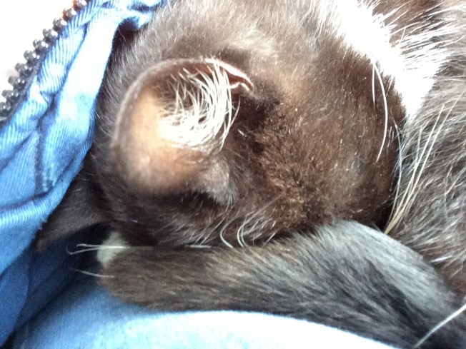 This was today. Once I stuffed him full of tuna and chicken, he hopped up on my lap, curled into a ball, tucked his head under my jacket and purred. He also has a weird, hitching breathing style that worries me.