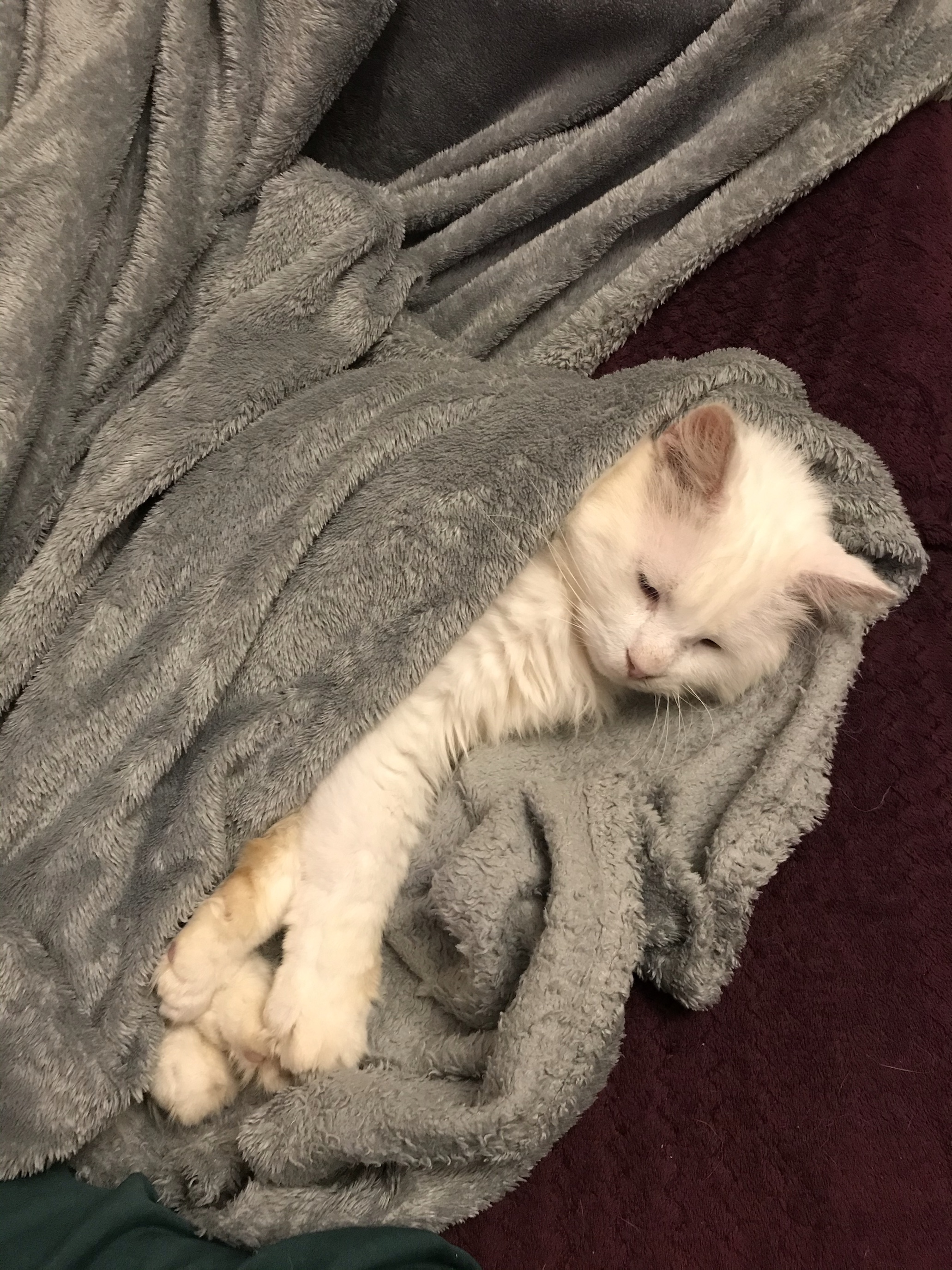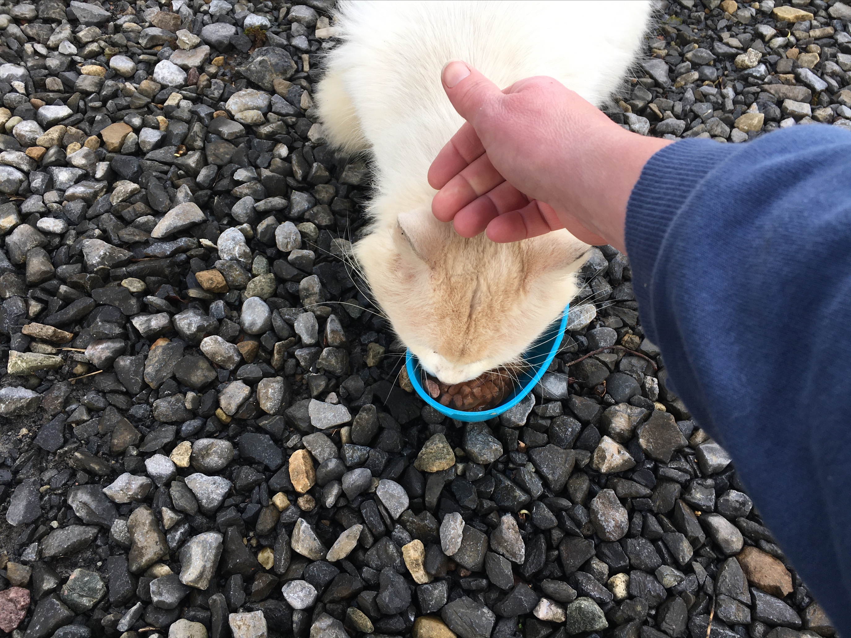 He was so good with what I assumed were his kittens. Maybe they were, maybe not… he also assumed they were his or just loved Peggy. In any case, he let momma cats Peggy and Vickie and all of the kittens steal his food without a hiss or a swat. He moved aside and looked filthily regal, like a white lion watching over his pride. He still kept his distance from me.