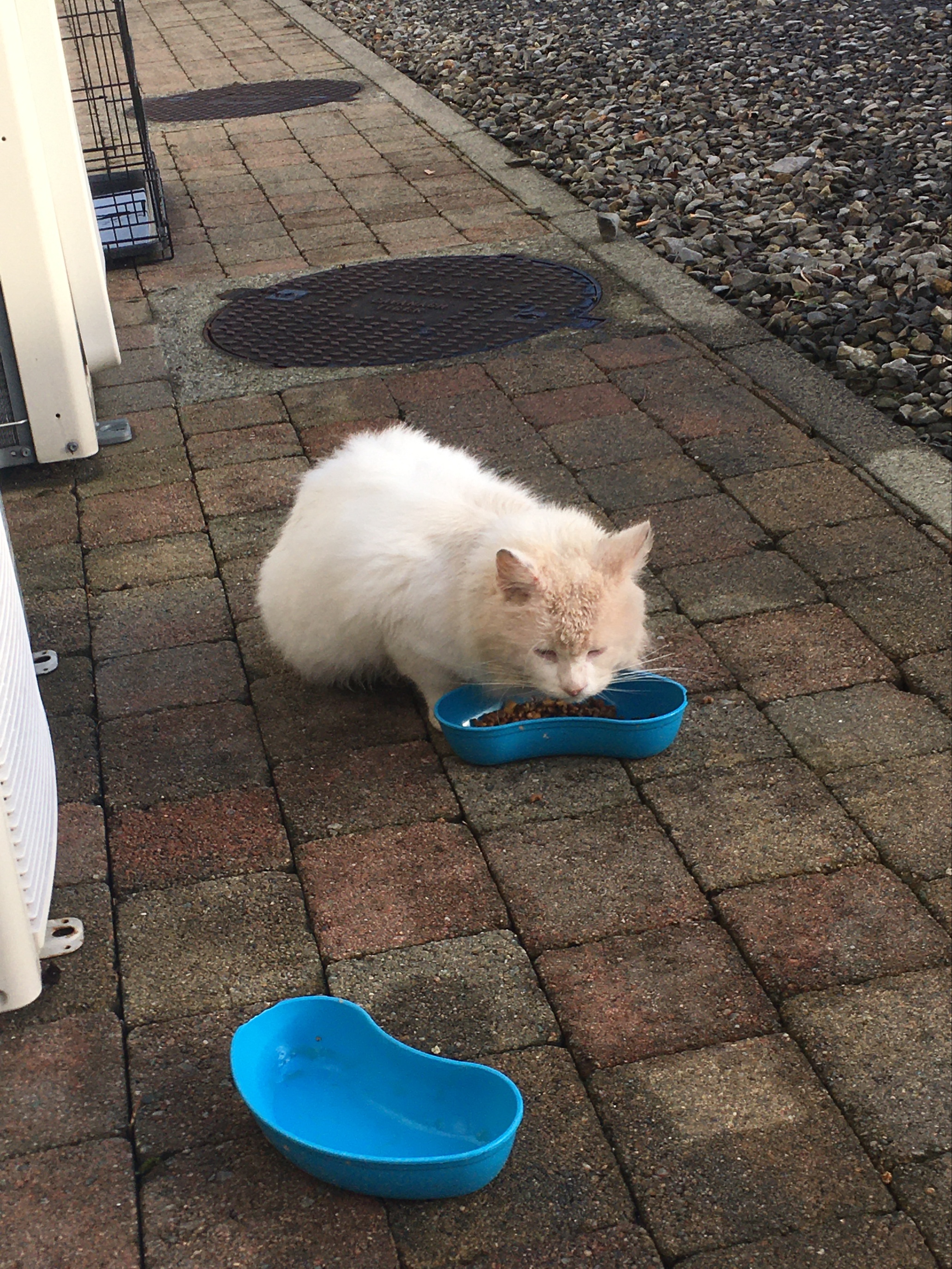 I’d seen him around work for a long time. I say ‘around’ because he never got close to me at all. I first noticed him after I had met and befriended Peggy. I’m not sure how many years it has been since I first spotted this white ghost slinking underneath cars in our parking lot.