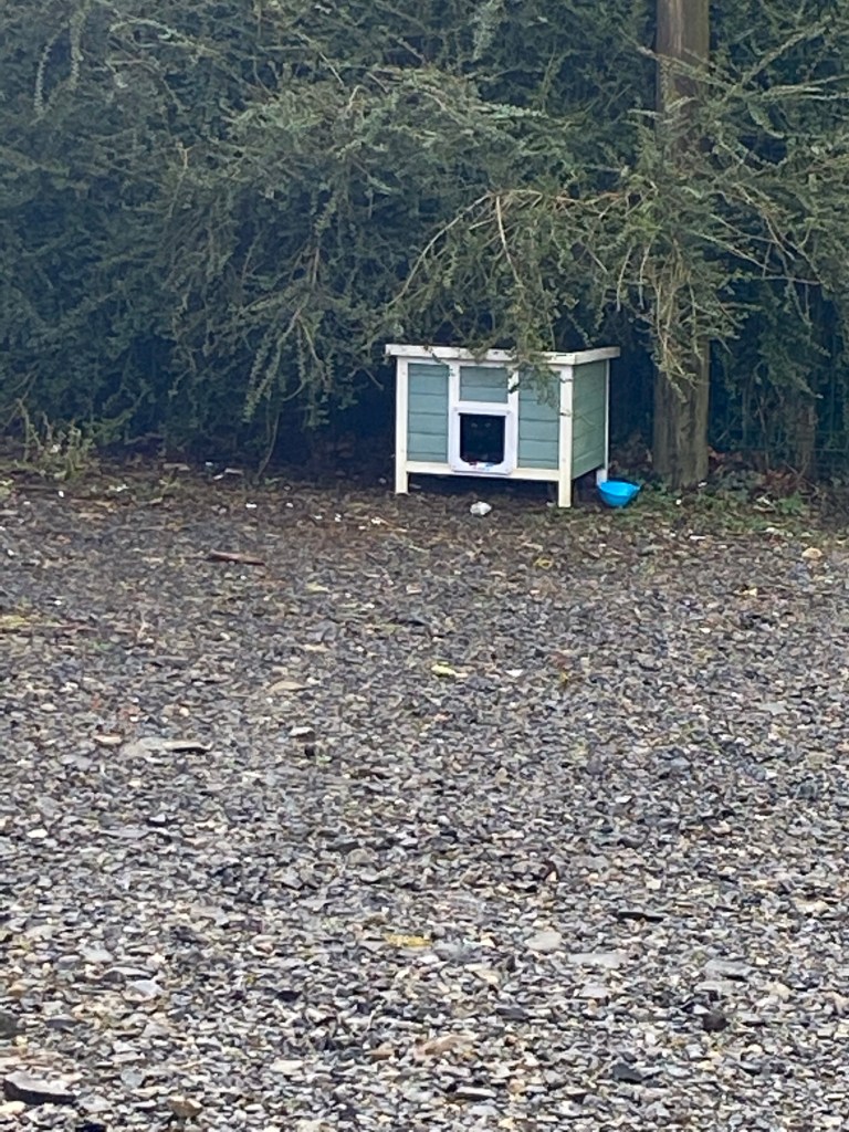 I still had the house, and Vickie (as the last of 14 cats I helped) is still at my workplace. She is super feral still, except around me. She is spayed, but lives under a car during the day and who-knows-which bush at night. I brought the house to work last week but she didn’t use it until today.