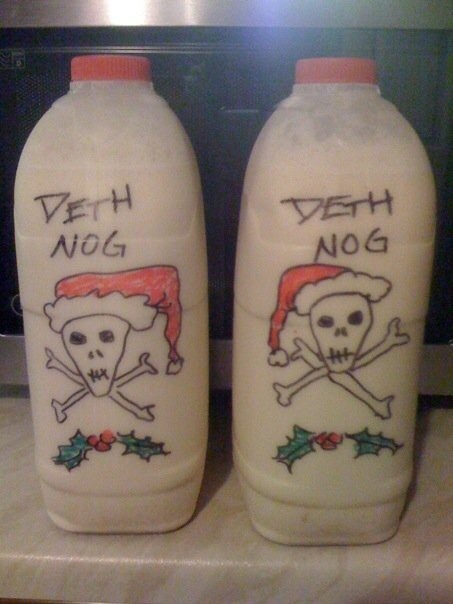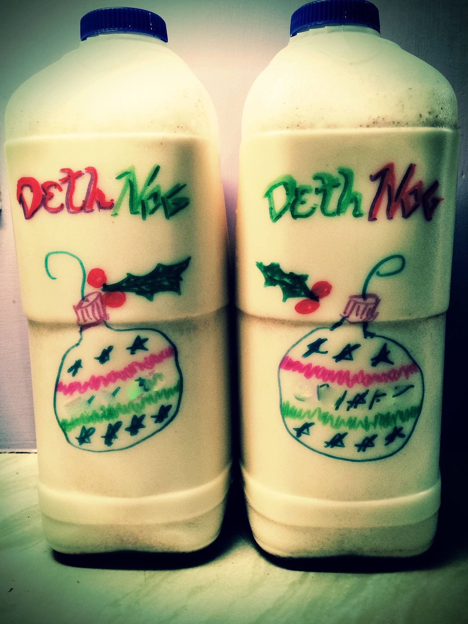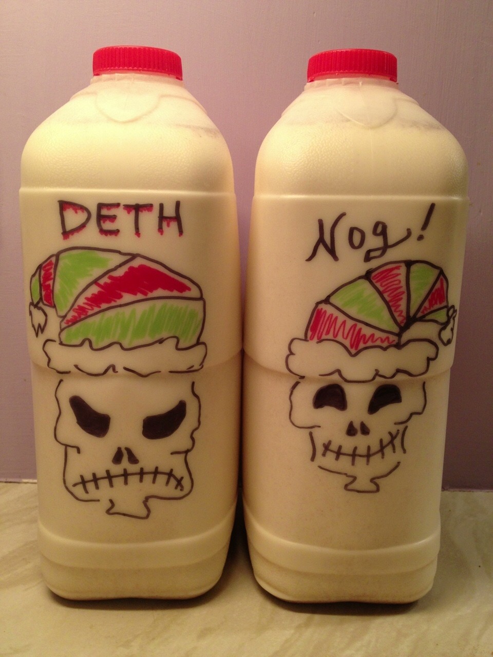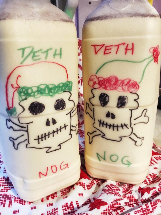 Half the fun of making it is drawing on the jug(s). This tradition started a long, long time ago when my mother accidentally put Nog into her morning coffee instead of milk. I sure hope she wasn’t planning to drive that morning!