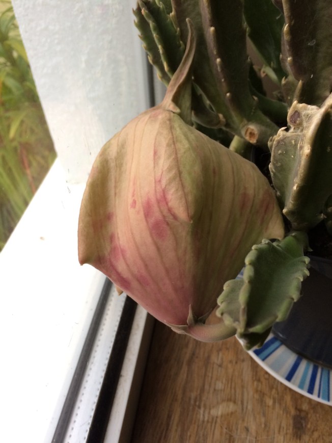For size comparison, the plate that the plant sits on is a side plate; it is not a dinner plate. Maybe what, about 8-10 inches across? I’m not getting close enough to measure the bloom! I’m a super-smeller and to me it smells like bad meaty cat breath. Urgh. Pretty, and pretty strange, however!