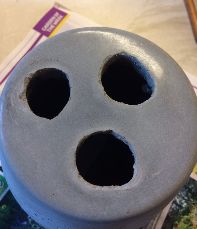 Next problem was how to get the concrete out of the lavender pot. I’ve already given a spoiler with the two pictures above that proves I did it. How? I ran the sink full of hot water and let it soak. I made sure not to get the ‘crete wet, and after 10 minutes I turned it upside down, gave it a couple of thumps with my hand and heard a welcome clunk when it fell out. Whew! Thermodynamics, baby!
