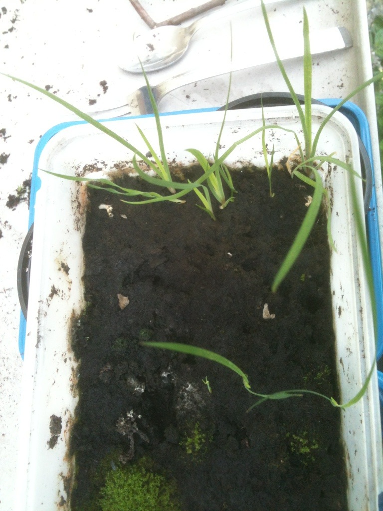 I don’t think I mentioned that I was doing another experiment, this time with what I hoped were seeds from my skinny purple iris. I put them into sifted fine soil, in a plastic take-out container that has a lid. Set it on a sunny windowsill and left it.* For about four months! Finally, when I remembered to check on it, there was life. Not just the moss and mould, but something that looked like grass. I sighed and supposed that it was grass, and was prepared to give up… until I took a closer look and realised that these were indeed baby iris plants! Go, me! *Same method I used to ahahaget the lilac seeds to germinate last year.