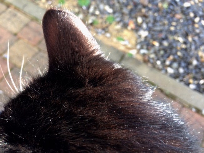 Well, the scars are accumulating. I hate to see it. She felt scabby underneath her right jaw last week, but seems better this week. Hard to see under there, she isn’t terribly keen on looking me in the face, still.