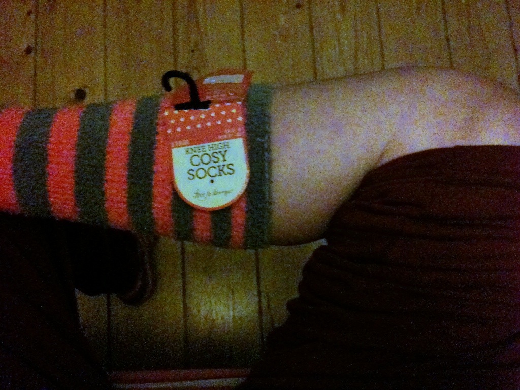 Finally, finally! A pair of socks I got for Christmas. Either they have no idea where the knee on someone who wears a size 8-to-10 (approx 10-12 in US women’s sizes!!!) sock is, or I’m a friggin’ giantess.