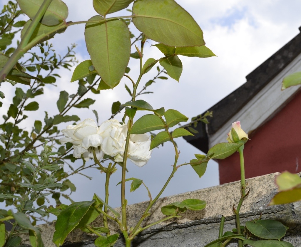 The damn white rose out back has bloomed at about 6.5 feet high. I can’t enjoy them way the hell up there! I think I’ll have to cut it back. It’s a climber, and seems dedicated to being a tree more than a bush.