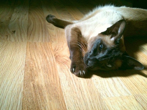 However, this means he gets to express his creative side! In the morning after one of his bad nights, I am greeted with artistically rendered swirls and skirls of light brown on my kitchen floor. Lokii has his own built-in palette, in sepia shades.
