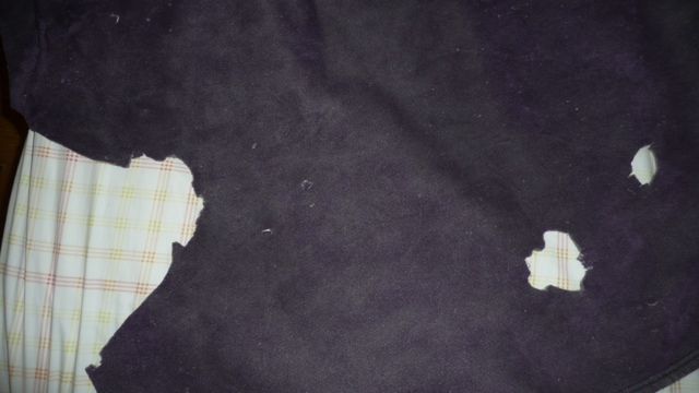 He’s also attracted to anything with ball-shaped filling. We had – had! two neck-pillows that we bought for travel. They were soft and scrunchy. I put them in the empty suitcases under the bed in the spare room, a logical place, yes? Where my logic failed me was that I should zip up the empty cases. I woke up to this one morning: